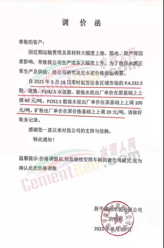 云南省玉溪市新平彝族傣族自治縣新平瀛洲水泥有限公司通知,因近期運輸費用及原材料大幅度上漲,限電、限產(chǎn)等因素影響,導(dǎo)致公司生產(chǎn)成本大幅度上升,為了確保水泥正常生產(chǎn)及供給,經(jīng)公司研究決定水泥價格做出調(diào)整。自2021年9月16日零時起發(fā)往各區(qū)域市場的P.A.S32.5散、袋裝,PO42.5水泥散、袋裝水泥出廠單價在原基礎(chǔ)上上調(diào)60元/噸,PO52.5散裝水泥出廠單價在原基礎(chǔ)上上調(diào)100元/噸,礦粉出廠單價在原價格基礎(chǔ)上上調(diào)20元/噸。