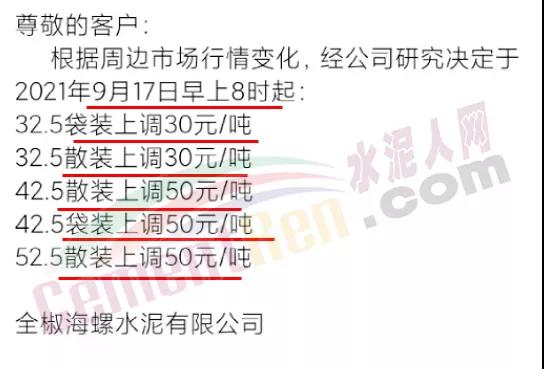 日前,全椒海螺水泥自9月17日早上8時起32.5級水泥上調(diào)30元/噸,42.5和52.5等級水泥上調(diào)50元/噸。
