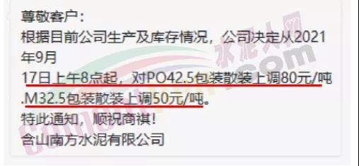 同日,含山南方水泥有限公司通知根據(jù)目前公司生產(chǎn)及庫存情況,公司決定從2021年9月17日上午8點起,對PO42.5包裝散裝上調(diào)80元/噸。M32.5包裝散裝上調(diào)50元/噸。