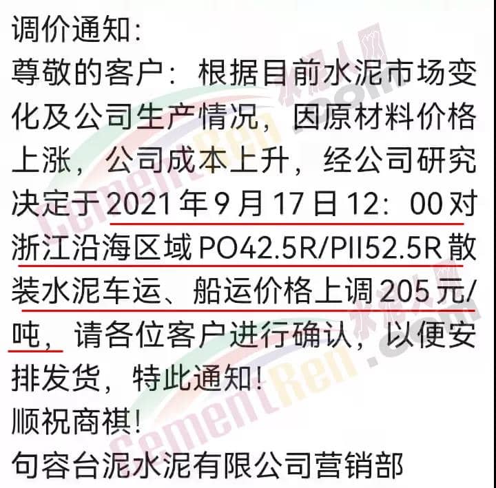 句容臺泥水泥有限公司通知稱,根據(jù)目前水泥市場變化及公司生產(chǎn)情況,因原材料價格上漲,公司成本上升,經(jīng)公司研究決定于2021年9月17日12時對浙江沿海區(qū)域PO42.5R/PII52.5R散裝水泥車運、船運價格上調(diào)205元/噸,創(chuàng)造了近年來單次漲價最高紀(jì)錄。