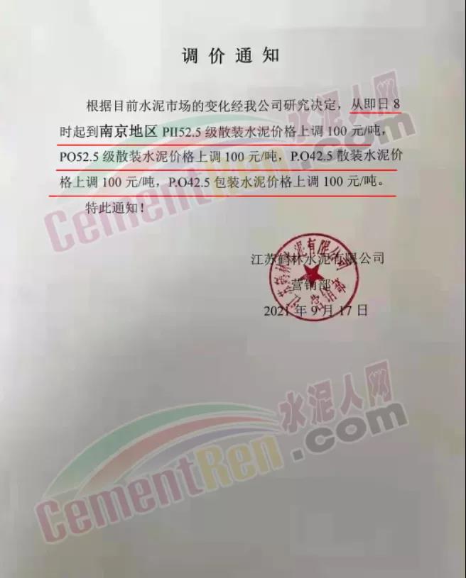 江蘇鶴林水泥有限公司通知,從17日8時起南京地區(qū)各標(biāo)號水泥上調(diào)100元/噸。