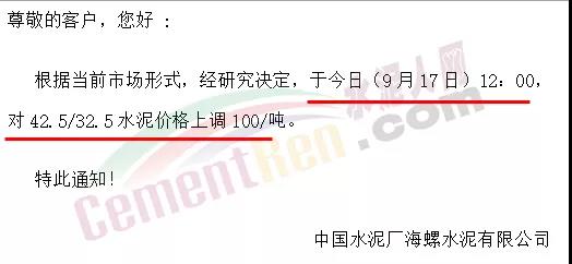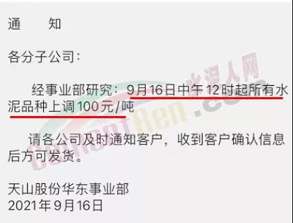 天山股份華東事業(yè)部通知,9月16日中午12時起所有水泥品種上調(diào)100元/噸。