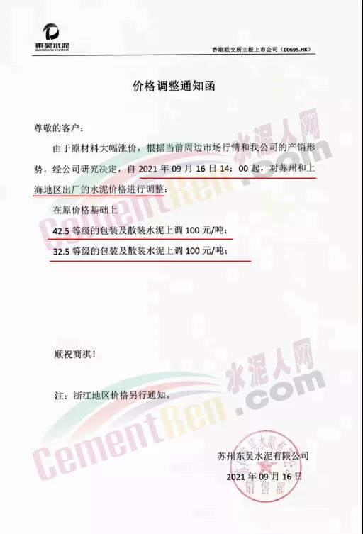 東吳水泥通知,由于原材料大幅漲價,根據(jù)當(dāng)前周邊市場行情及公司的產(chǎn)銷形勢,自9月16日14時起,對蘇州和上海地區(qū)的出廠水泥價格上調(diào)100元/噸。