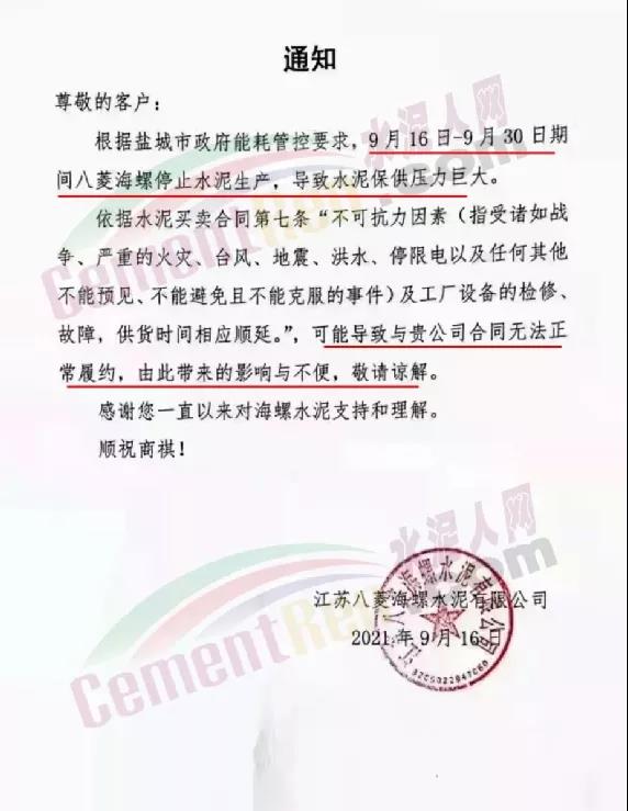 據(jù)水泥人網(wǎng)此前消息,9月16日八菱海螺發(fā)通知稱,根據(jù)江蘇省鹽城市政府能耗管控要求,9月16日-9月30日期間八菱海螺停止水泥生產(chǎn),導(dǎo)致水泥保供壓力巨大。不可抗力因素可能導(dǎo)致與貴公司合同無法正常履約。