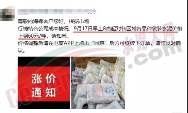 湖南地區(qū)雙峰海螺、漣源海螺、邵陽海螺通知自9月17日起,對所有區(qū)域各品種水泥出廠價上調(diào)60元/噸。