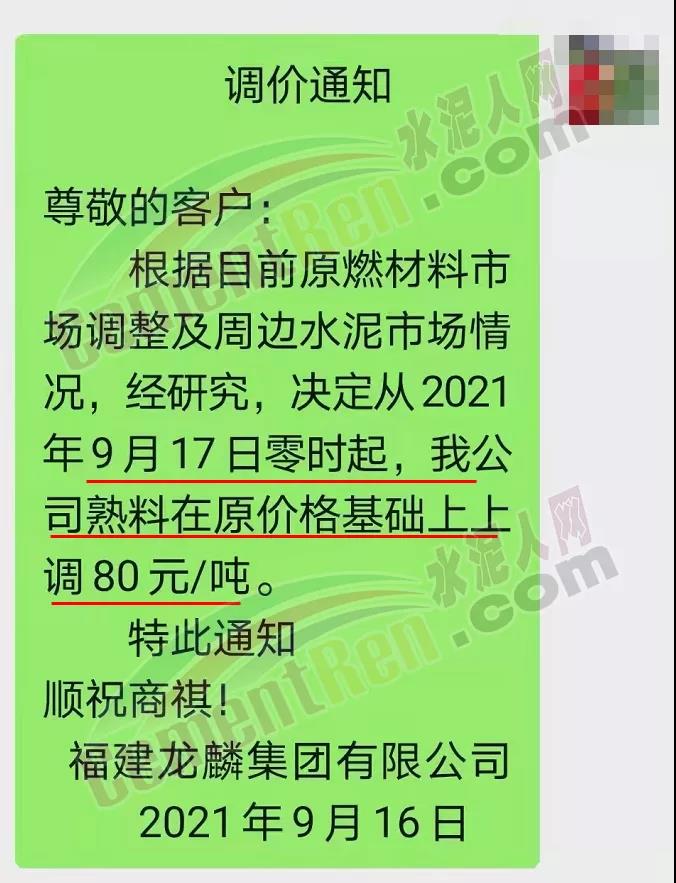 福建龍麟集團通知,9月17日零時起,公司熟料在原價基礎(chǔ)上上調(diào)80元/噸。