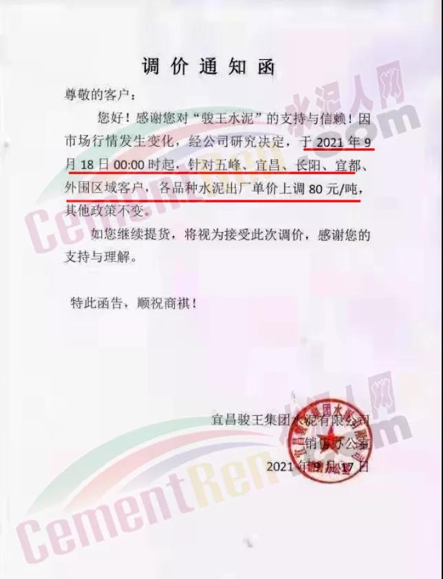 湖北宜昌駿王集團通知9月18日0時起,針對五峰、宜昌、長陽、宜都外圍區(qū)域客戶,各品種水泥出廠單位上調(diào)80元/噸。