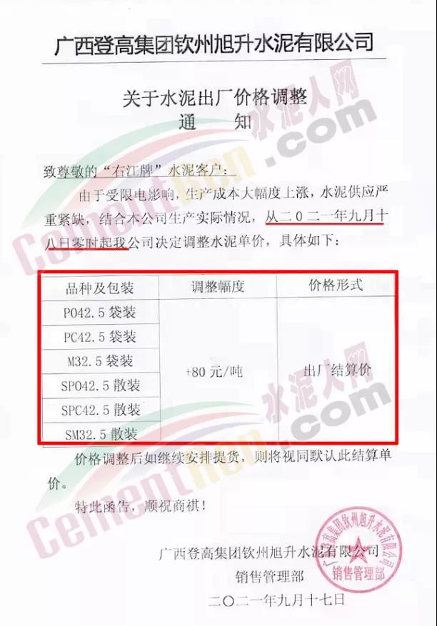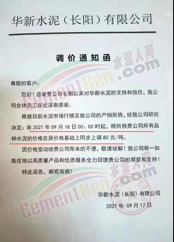 根據(jù)當(dāng)前市場行情,我司決定自2021年9月18日零時起,上調(diào)三明區(qū)域各品種袋、散水泥價格80元/噸。特此通知!