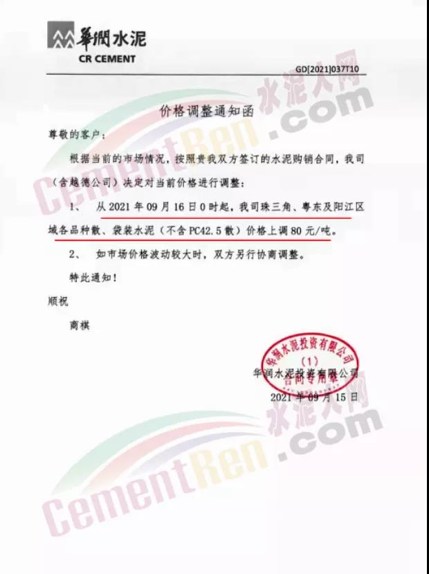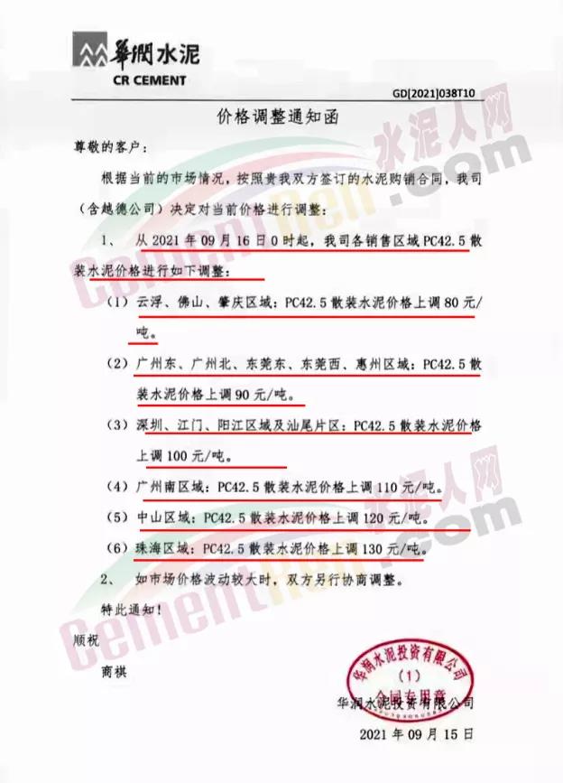 華潤水泥通知根據(jù)當(dāng)前的市場情況,公司(含越德公司)從2021年9月16日0時起,公司各銷售區(qū)域PC42.5散裝水泥價格進行調(diào)整:
