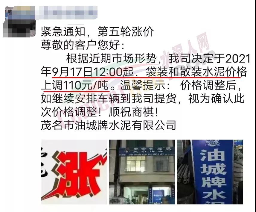 茂名市油城牌水泥有限公司通知,于9月17日12時起上調(diào)水泥價格110元/噸。