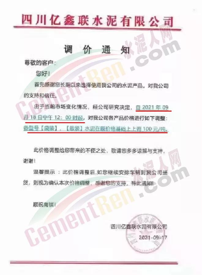 四川億鑫聯(lián)水泥通知,9月18日中午12時起,各標(biāo)號水泥上調(diào)100元/噸。
