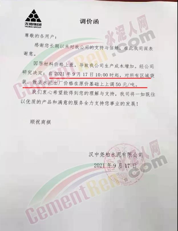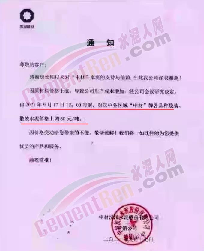 中材漢江水泥通知,自9月17日12時起對漢中各區(qū)域“中材”牌各品種水泥上調(diào)50元/噸。