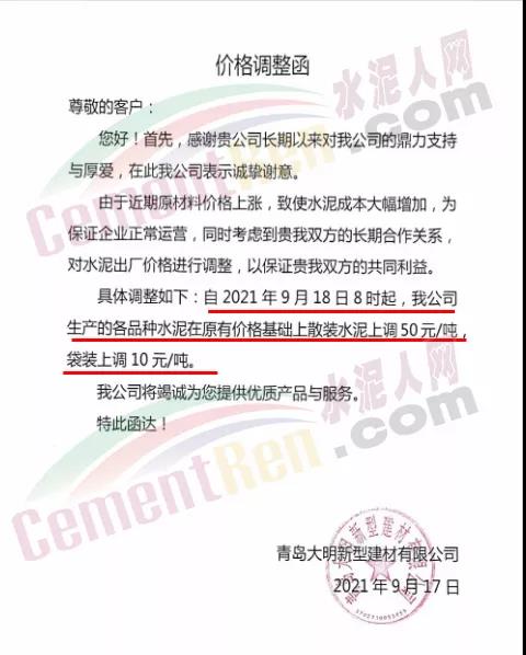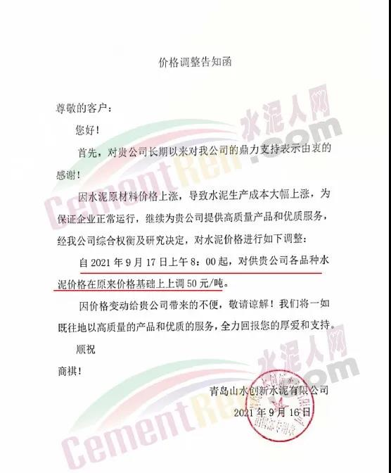 山東山水水泥集團有限公司青島分公司通知由于各類原材料成本大幅度上漲,導(dǎo)致水泥生產(chǎn)成本大幅提高。鑒于以上原因,經(jīng)公司綜合權(quán)衡決定自2021年9月17日上午8時起,公司生產(chǎn)的各品種水泥在原價格基礎(chǔ)上統(tǒng)一上調(diào)50元/噸。