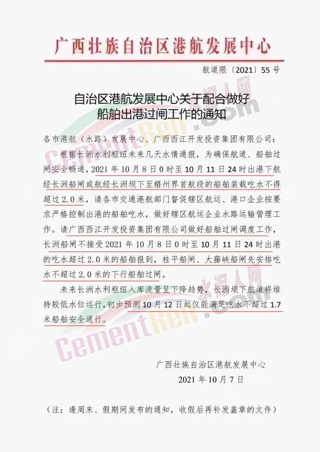 請(qǐng)廣西西江開發(fā)投資集團(tuán)有限公司做好船舶過閘調(diào)度工作,長洲船閘不接受2021年10月8日0時(shí)至10月11日24時(shí)出港的吃水超過2.0米的船舶報(bào)到,桂平船閘、大藤峽船閘先安排吃水不超過2.0米的下行船舶過閘。