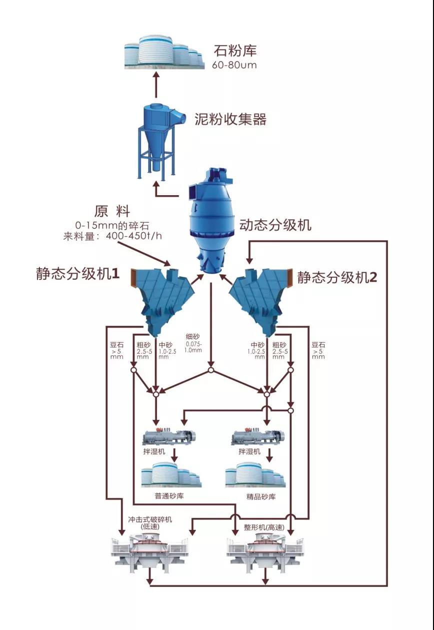 經(jīng)過破碎、整形后的物料,通過輸送設(shè)備送入【靜態(tài)分級機2】,分離出豆石、粗砂、中砂。細(xì)砂和石粉隨氣流進入共用的動態(tài)分級機分離出細(xì)砂、石粉、超細(xì)粉。按設(shè)計的配料要求,將粗砂、中砂、細(xì)砂按比例進行配制,然后送入【拌濕機2】,添加適量的水進行拌濕,最后送入精品砂庫或砂堆中, 多余的粗料按不同的粒徑再分別返回到制砂機、整形機分別進行破碎、整形,從而形成閉路生產(chǎn)。