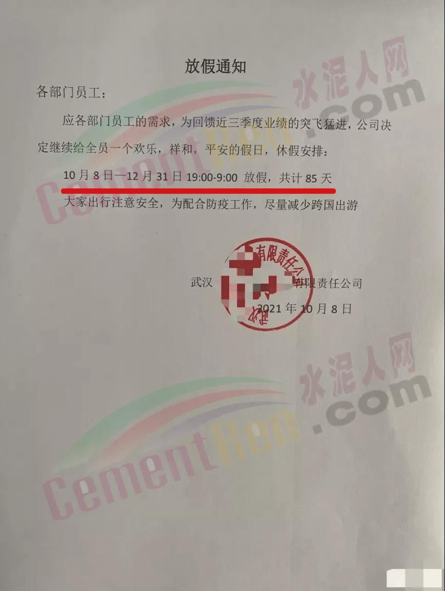 近日,湖北武漢某企業(yè)發(fā)布放假通知,稱應(yīng)各部門員工的需求,為回饋近三季度業(yè)績的突飛猛進(jìn),決定繼續(xù)給全員一個歡樂,祥和,平安的假日,休假安排:10月8日一12月31日19:00-9:00放假,共計(jì)85天。