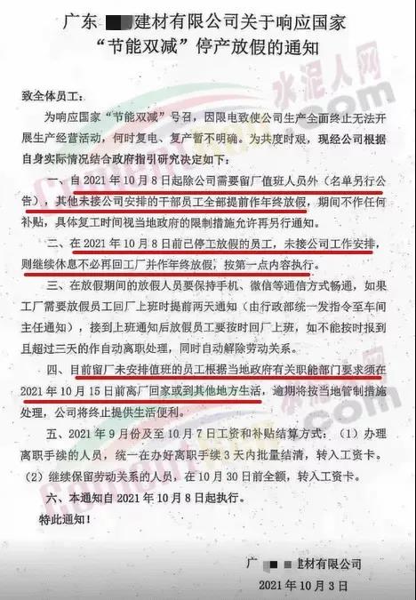 同日,遼寧省遼陽市工信局發(fā)布通知要求自2021年10月9日8時(shí)起,對水泥行業(yè)8戶熟料企業(yè)、11條熟料生產(chǎn)實(shí)施有序用電措施,期間水泥熟料生產(chǎn)停止用電,有序用電時(shí)間預(yù)計(jì)不低于15天,結(jié)束時(shí)間另行通知。同時(shí)要求對擅自啟動水泥熟料生產(chǎn)用電的企業(yè),要責(zé)令改正,情節(jié)嚴(yán)重的停止供電。