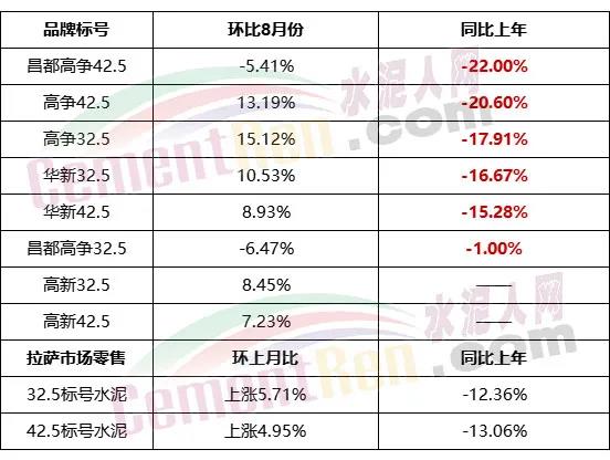 據(jù)西藏自治區(qū)發(fā)改委公開數(shù)據(jù)顯示,9月份水泥非重點項目出廠價格與上年同期相比跌幅最高達到22%。42.5標號水泥拉薩市場平均零售價下跌13.06%。