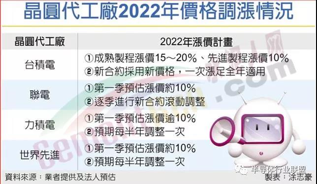 代工產(chǎn)能供應(yīng)荒或?qū)⒊掷m(xù)至2022年,繼臺(tái)積電后,聯(lián)電、力積電、世界先進(jìn)等,據(jù)稱近期已陸續(xù)通知客戶明年第一季度再度漲價(jià)超10%,且強(qiáng)調(diào)上半年產(chǎn)能已全部預(yù)訂完畢,訂單能見度看至下半年。據(jù)臺(tái)媒報(bào)道,根據(jù)業(yè)內(nèi)預(yù)估,臺(tái)積電方面明年漲幅在10%-20%之間,價(jià)格全年適用,聯(lián)電、力積電、世界先進(jìn)明年第一季度漲價(jià)均超10%,但此后均可能再調(diào)整,其中聯(lián)電逐季滾動(dòng)調(diào)整,力積電、世界先進(jìn)均為每半年調(diào)整一次。
