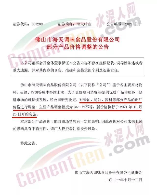 10月12日,海天味業(yè)發(fā)布部分產(chǎn)品價(jià)格調(diào)整公告,公告稱對(duì)醬油、蠔油、醬料等部分產(chǎn)品的出廠價(jià)格進(jìn)行調(diào)整,調(diào)整幅度為3%~7%不等,新價(jià)格執(zhí)行于2021年10月25日開始實(shí)施。