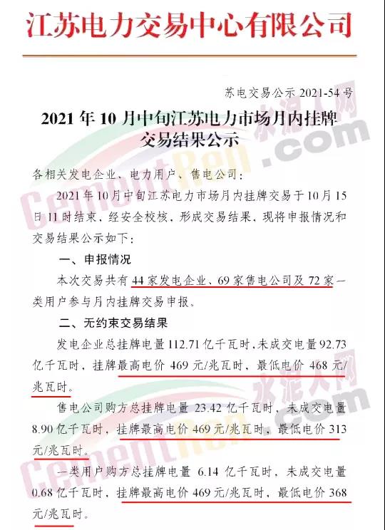 江蘇省10月中旬月內(nèi)掛牌交易,共成交電量19.98億千瓦時(shí),成交均價(jià)468.97元/兆瓦時(shí),成交價(jià)較基準(zhǔn)價(jià)上浮了19.94%。