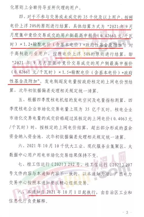 廣西發(fā)布《自治區(qū)工業(yè)和信息化廳關(guān)于進(jìn)一步調(diào)整2021年全區(qū)電力市場化交易方案的緊急通知》,在緊急通知中,高耗能企業(yè)電價(jià)直接上浮50%進(jìn)行結(jié)算。工商業(yè)及其他用電,執(zhí)行《2021-2022廣西電網(wǎng)輸配電價(jià)表》。