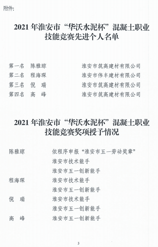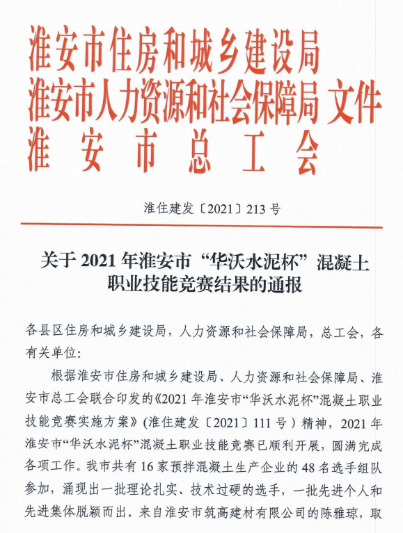 日前,?2021年淮安市“華沃水泥杯”混凝土職業(yè)技能競(jìng)賽已圓滿完成各項(xiàng)工作,共有16家預(yù)拌混凝土生產(chǎn)企業(yè)的48名選手組隊(duì)參加,涌現(xiàn)出一批理論扎實(shí)、技術(shù)過硬的選手,一批先進(jìn)個(gè)人和先進(jìn)集體脫穎而出。