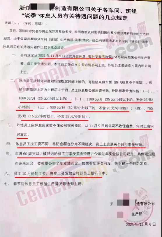 近日,某制造企業(yè)發(fā)布通知稱:從2021年11月9日正式開始休息,暫時至春節(jié)放假。休息期間如果公司生產(chǎn)需要,員工接到通知后,本地員工務(wù)必在2天內(nèi)到公司上班,外地員工務(wù)必在4天內(nèi)回公司上班。