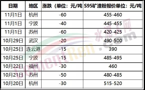 據(jù)水泥人網(wǎng)了解,受鋼價下調(diào)帶動,近日長江沿線及周邊區(qū)域S95礦渣粉報價跟降,相關(guān)數(shù)據(jù)顯示,自10月下旬以來,江蘇蘇州兩次下調(diào)礦渣粉價格,累計下調(diào)110元/噸;浙江杭州礦渣粉兩次下調(diào)報價,累計下調(diào)90元/噸,寧波兩次下調(diào)55元/噸。