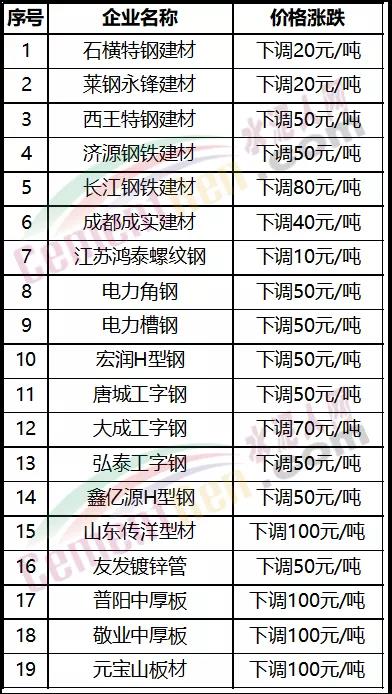 11月9日近20家鋼廠調(diào)價,其中下跌最大為山東傳洋型材,一次性下調(diào)報價100元/噸,具體調(diào)價明細(xì)如下: