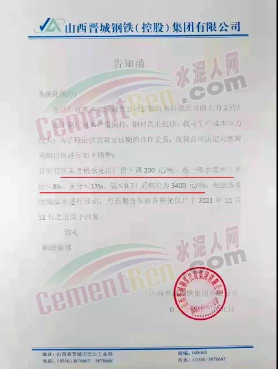 山西晉城鋼鐵控股集團有限公司告知函稱,由于鋼材成本嚴(yán)重倒掛,鋼材需求低迷,企業(yè)生產(chǎn)成本壓力較大。為了穩(wěn)定供需雙方長期的合作關(guān)系,企業(yè)決定對焦炭采購價格進(jìn)行調(diào)整。對所有焦炭含稅承兌出廠價下調(diào)200元/噸。