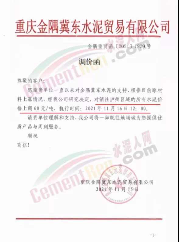 重慶金隅冀東水泥貿(mào)易有限公司通知,根據(jù)目前原材料上漲情況,經(jīng)公司研究決定,對銷往瀘州區(qū)域的所有水泥價格上調60元/噸,執(zhí)行時間2021年11月16日12:00。