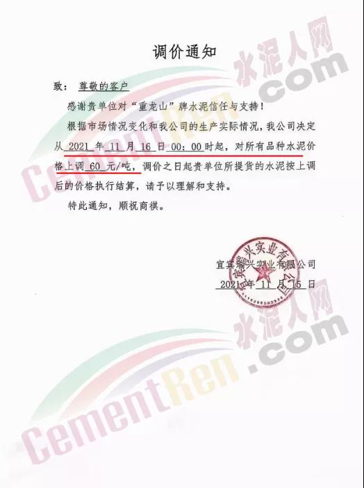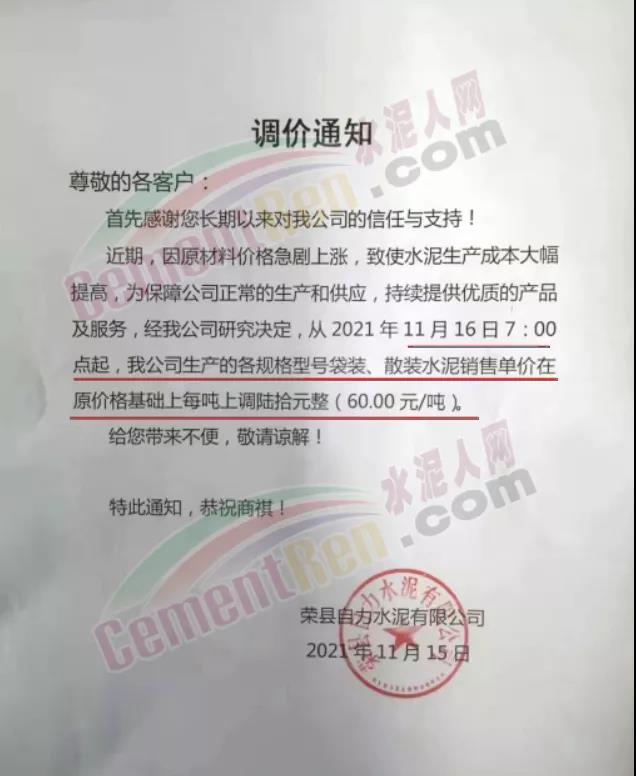 榮縣自力水泥有限公司通知,因原材料價格急劇上漲,致使水泥生產(chǎn)成本大幅提高,為保障公司正常的生產(chǎn)和供應,持續(xù)提供優(yōu)質的產(chǎn)品及服務,經(jīng)公司研究決定,從2021年11月16日7點起,公司生產(chǎn)的各規(guī)格型號袋裝、散裝水泥銷售單價在原價格基礎上上調60元/噸。