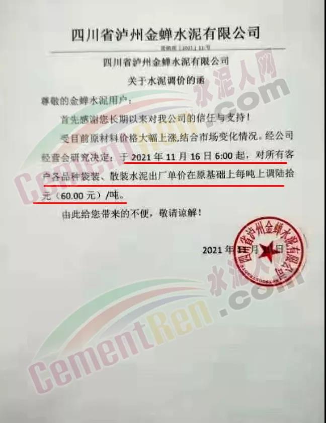 四川省瀘州金蟬水泥有限公司通知,受目前原材料價格大幅上漲影響,結合市場變化情況。經(jīng)公司經(jīng)營會研究決定于2021年11月16日6時起,對所有客戶各品種袋裝、散裝水泥出廠單價在原基礎上調60元/噸。