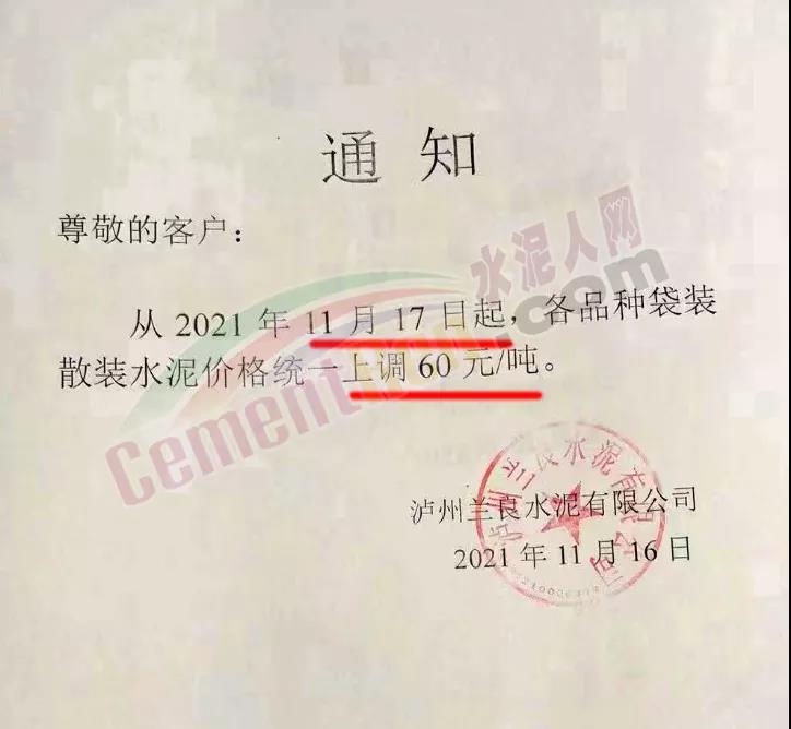 瀘州蘭良水泥有限公司通知,自11月17日起,各品種袋裝、散裝水泥價格統(tǒng)一上調60元/噸。
