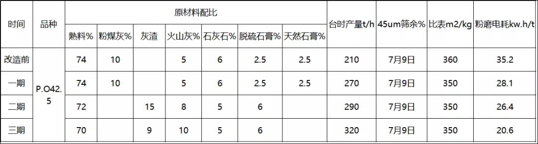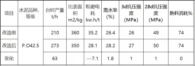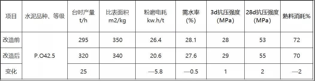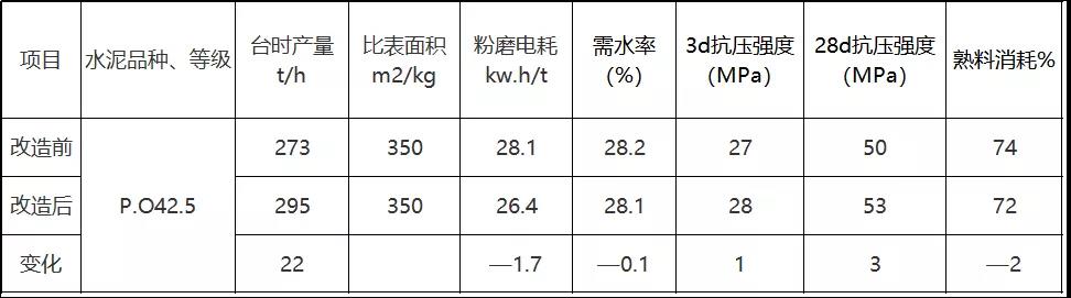 三期改造是專門針對節(jié)能降耗進行的技改工程,月度平均臺時達到320 t/h。提產25t/h左右;電耗下降5.8kw.h/t,熟料消耗下降2%。水泥3天、28天強度均有提高,取得了滿意的效果。