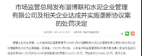 據(jù)了解,今年2月9日國家市場監(jiān)督管理總局反壟斷局發(fā)布淄博聯(lián)合水泥企業(yè)管理有限公司及相關企業(yè)達成并實施壟斷協(xié)議案的處罰決定。2021年1月28日,山東省市場監(jiān)督管理局對8家涉案當事人依法作出沒收違法所得8657.2萬元并處2018年度銷售額2%的罰款計14172.3萬元,罰沒款共計22829.5萬元。