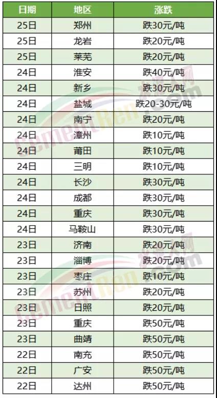 川渝地區(qū)大氣污染防控,環(huán)保管制加嚴(yán),加上一些項(xiàng)目因資金緊張,水泥市場需求低迷。各企業(yè)庫存高位運(yùn)行。同時(shí)遭遇外來低價(jià)水泥沖擊,競爭加劇。區(qū)域主要品牌企業(yè)陸續(xù)通知下調(diào)水泥價(jià)格,其中重慶、達(dá)州、廣安、南充以及云南曲靖等多地水泥價(jià)格跌50-80元/噸。重慶區(qū)域23、24日連續(xù)兩次下調(diào)水泥價(jià)格,累計(jì)下跌50-80元/噸,絕大多數(shù)企業(yè)下調(diào)金額在20-30元/噸之間。