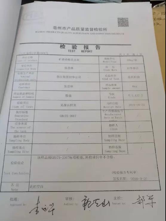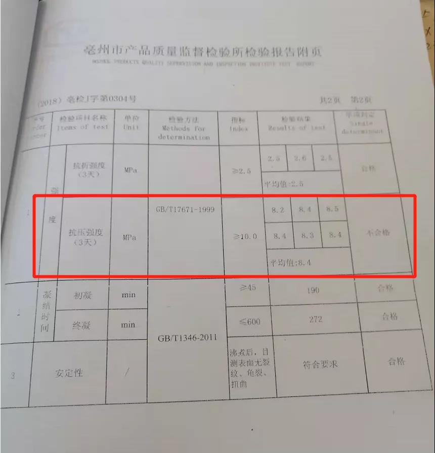 在此期間,消費(fèi)者通過質(zhì)量監(jiān)督檢測部門檢測,確認(rèn)水泥質(zhì)量不合格。檢驗(yàn)報(bào)告如下: