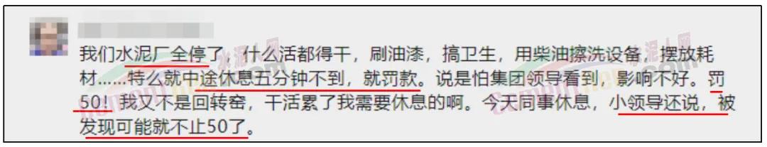 有網(wǎng)友留言稱(chēng):“水泥廠(chǎng)全停了,員工什么活都得干。刷油漆,搞衛(wèi)生,用柴油擦洗設(shè)備,擺放耗材……中途休息五分鐘不到,就罰款。說(shuō)是怕集團(tuán)領(lǐng)導(dǎo)看到,影響不好。罰50!我又不是回轉(zhuǎn)窯,干活累了我需要休息的啊。今天同事休息,小領(lǐng)導(dǎo)還說(shuō),被發(fā)現(xiàn)可能就不止50了。”
