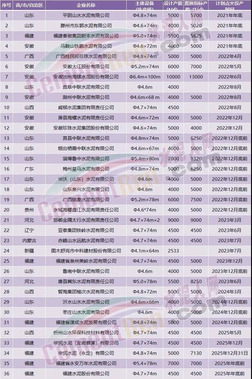 同時,有大量的智能化高產(chǎn)水泥生產(chǎn)線陸續(xù)建成投產(chǎn)。據(jù)不完全統(tǒng)計從2021年至2025年底前將有37條5340.9萬噸/年。新型干法水泥熟料生產(chǎn)線點火投產(chǎn)。擬于2021年12月-2025年12月期間點火投產(chǎn)部分生產(chǎn)線如下: