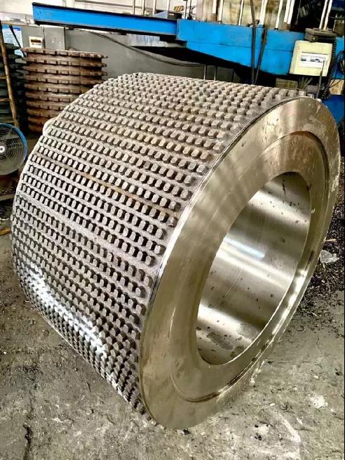 8、鑲鑄陶瓷合金棒復(fù)合輥比目前市場(chǎng)上使用的柱釘復(fù)合輥優(yōu)勢(shì)明顯,柱釘復(fù)合輥是在輥套上鉆孔,用膠合劑粘柱釘敲入輥套中使用,但經(jīng)不起原料溫度的變化,柱釘會(huì)脫落,造成擠壓輥產(chǎn)量和質(zhì)量的降低。而鑲鑄陶瓷合金棒復(fù)合輥經(jīng)過鋼水熱復(fù)合解決了合金棒的脫落現(xiàn)象,充分提高設(shè)備的繼續(xù)使用,降低修復(fù)成本提高產(chǎn)能,起到了很好的效果。