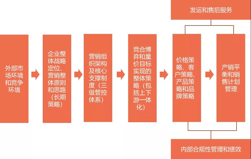 中國水泥企業(yè)營銷實(shí)踐從2000年左右到今天經(jīng)歷了20年左右的發(fā)展。它從最初粗放的水泥定價(jià)——“窗口望一望”模式,逐漸發(fā)展到現(xiàn)在層級化管理+職能化管理+制度化管理的體系化營銷管理模式。水泥頭部企業(yè)通過彼此間的交流和借鑒,在水泥營銷思路和戰(zhàn)術(shù)方法方面已經(jīng)非常相似,總結(jié)起來水泥營銷管理框架和主脈絡(luò)如下: