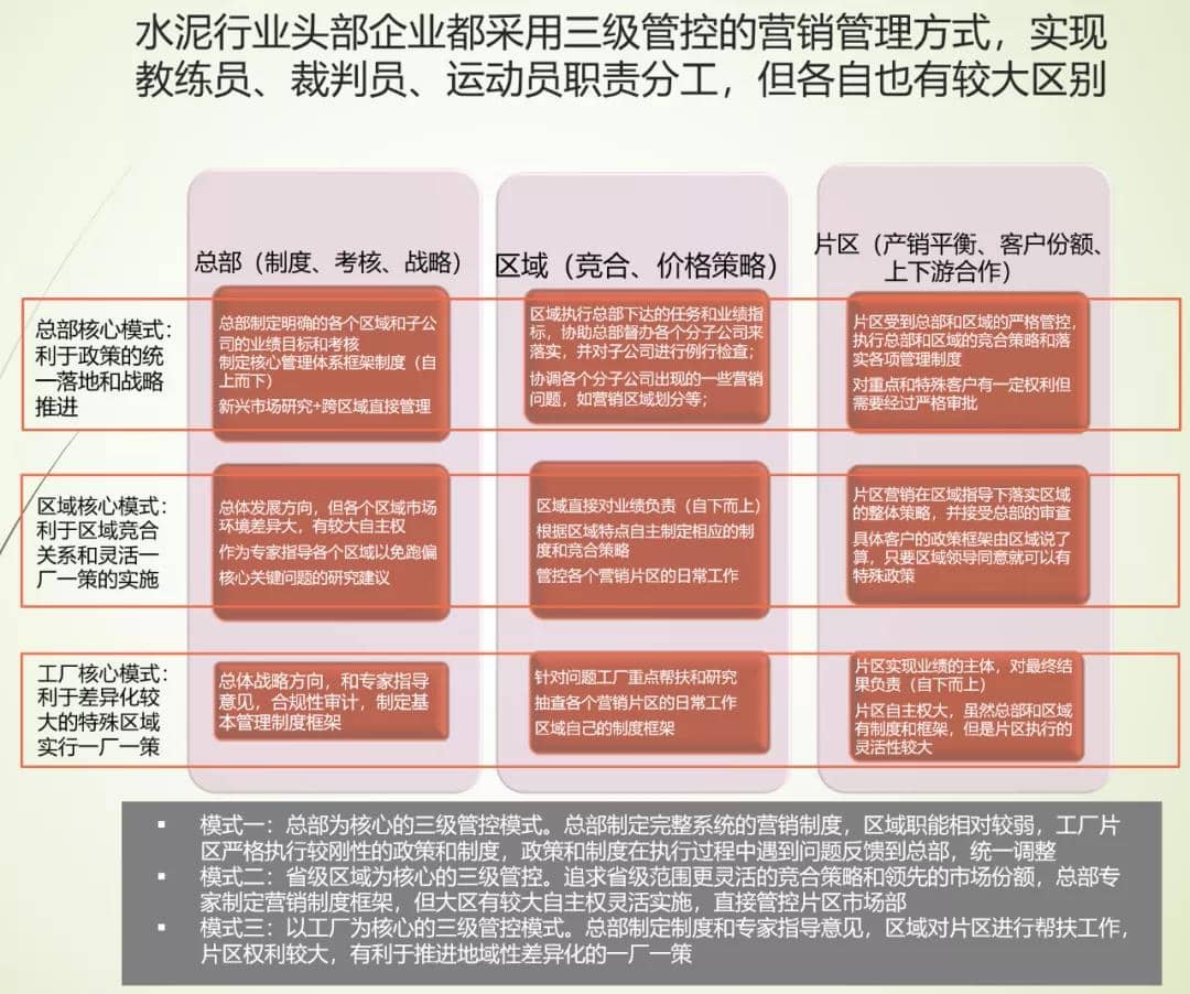 水泥頭部企業(yè)現(xiàn)在普遍采用的三級管控模式同時(shí)也有各自的特點(diǎn)