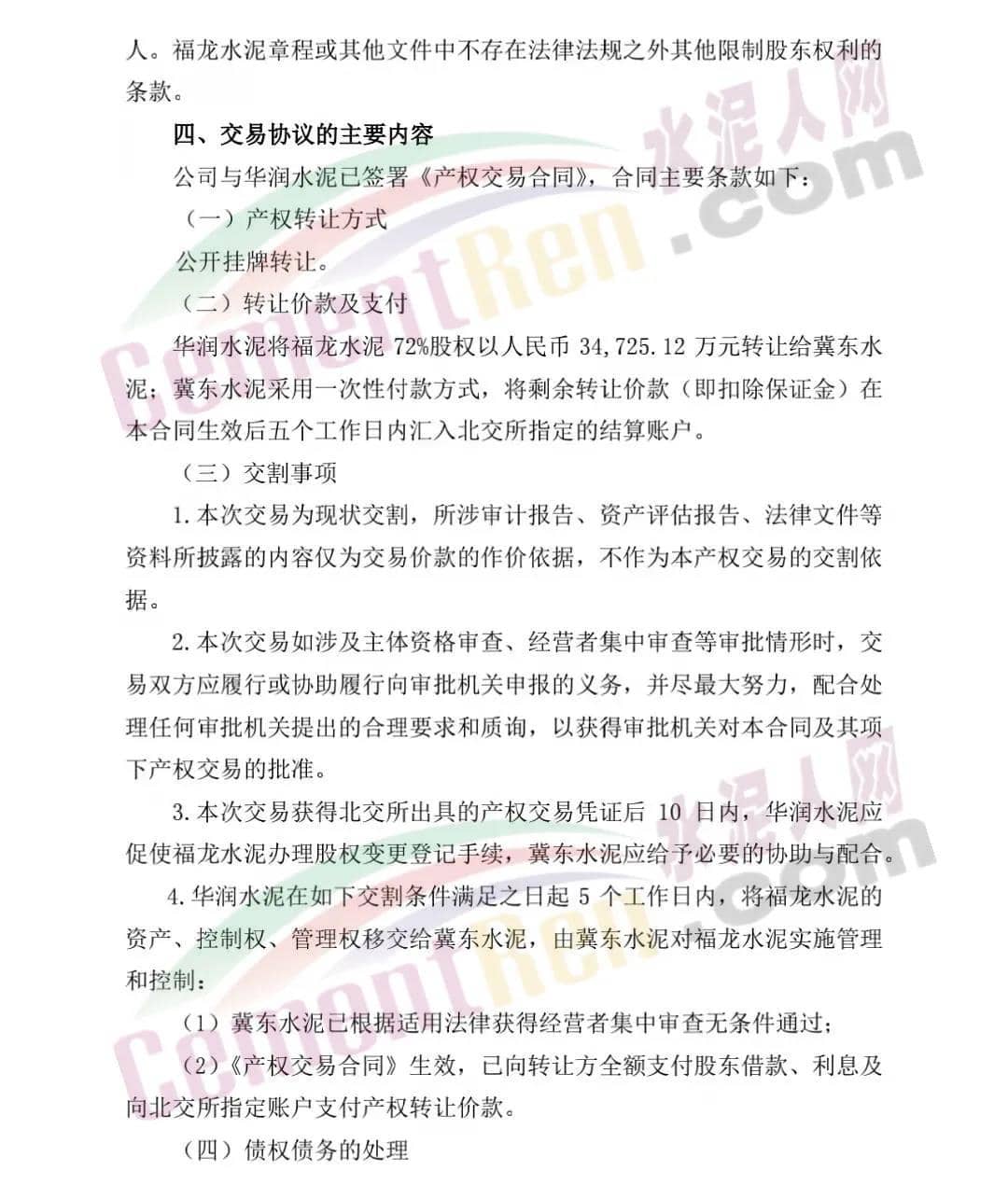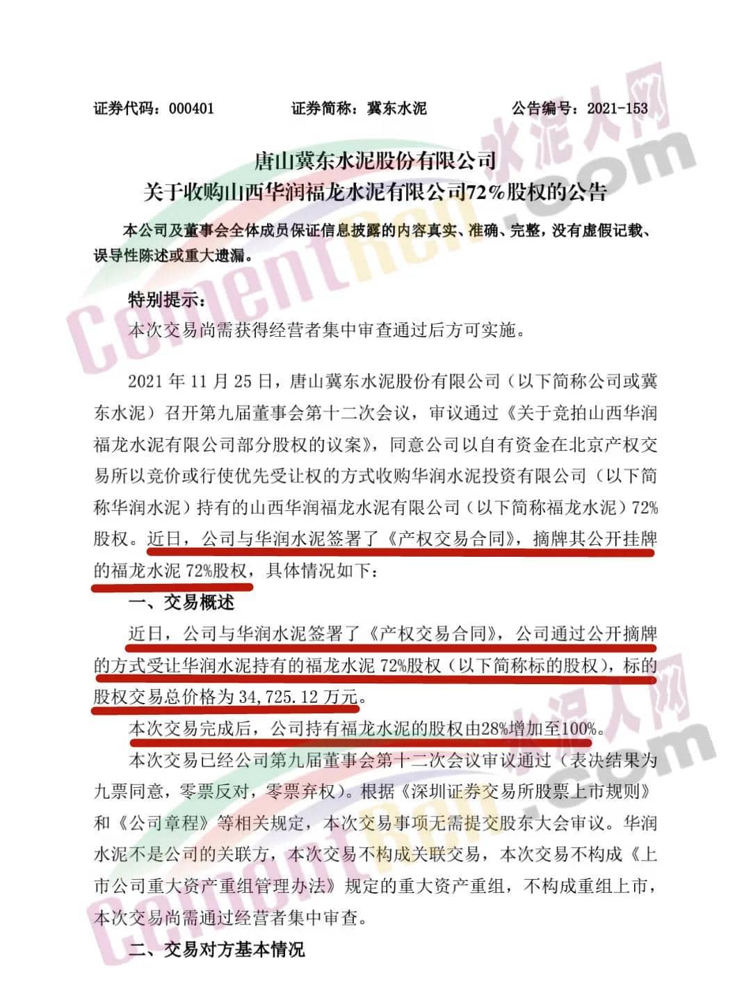 12月15日晚間,冀東水泥發(fā)布公告稱,近日,公司通過公開摘牌的方式受讓華潤(rùn)水泥持有的福龍水泥72%股權(quán),標(biāo)的股權(quán)交易總價(jià)格為3.47億元。此次交易完成后,公司持有福龍水泥的股權(quán)由28%增加至100%。福龍水泥擁有完整的水泥熟料生產(chǎn)線,裝備和工藝水平比較先進(jìn),擁有資源品位較好的石灰石礦山,周邊輔材豐富,生產(chǎn)成本在區(qū)域處于領(lǐng)先水平。此次交易有利于公司優(yōu)化山西區(qū)域的產(chǎn)能結(jié)構(gòu)。