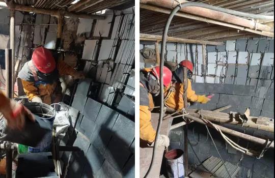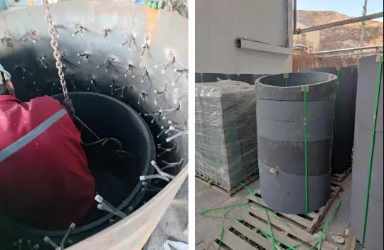 不久前,河北某水泥企業(yè)的下料管在運(yùn)行過程中由于結(jié)皮影響系統(tǒng)的通風(fēng),使阻力增大,不僅使能耗上升,而且結(jié)皮嚴(yán)重造成堵塞時,有時被迫停窯處理,嚴(yán)重影響經(jīng)濟(jì)效益。為此,該水泥企業(yè)將南極星微晶管應(yīng)用于其下料管內(nèi)部,現(xiàn)場施工圖片如下: