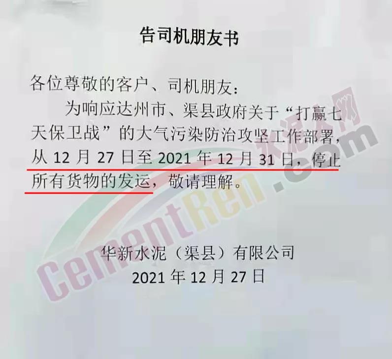 水泥人網(wǎng)通訊員消息:華新水泥渠縣公司發(fā)布通知稱,為響應達州市、渠縣政府關(guān)于“打贏七天保衛(wèi)戰(zhàn)的大氣污染防治攻堅工作部署”從12月27日至12月31日停止所有貨物的發(fā)運。