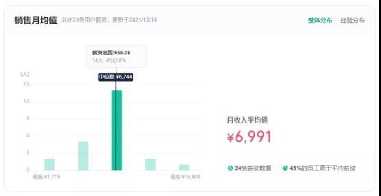 銷售崗位24條用戶薪資,月收平均值為6991元,最高16900元/月,最低1716元/月,45%的員工薪資高于平均水平。擁有3年經驗的商務經理月薪為16900元,1年以下經驗的普遍銷售員月薪1716-2700元。擁有1年以上經驗的銷售員月薪在5300元左右。