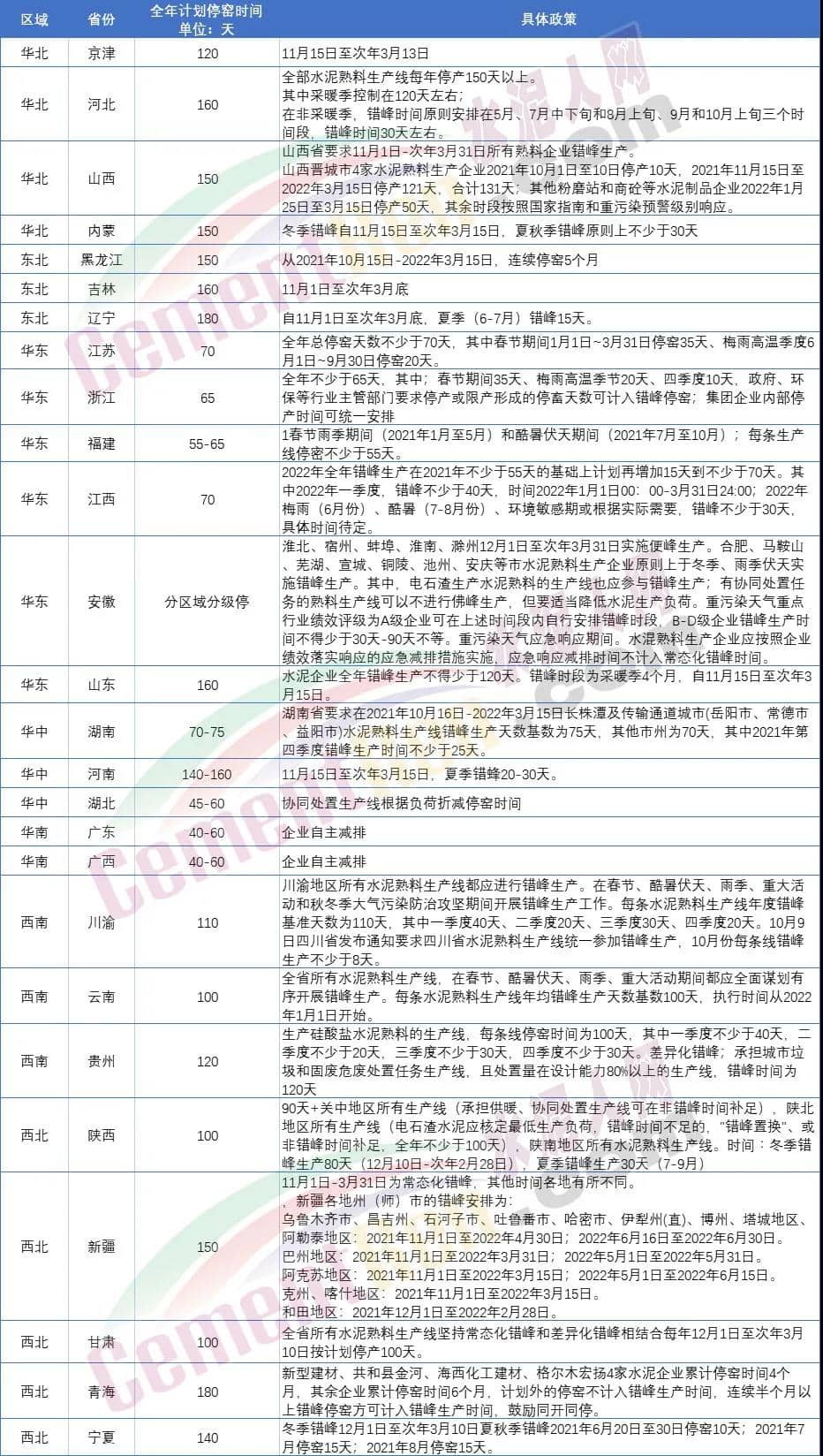 應(yīng)工信部、生態(tài)環(huán)境部兩部委關(guān)于進一步做好水泥常態(tài)化錯峰生產(chǎn)的通知要求,絕大部分省份都提前發(fā)布了2022年全年錯峰生產(chǎn)計劃,全年停產(chǎn)基準天數(shù)最長達到180天。