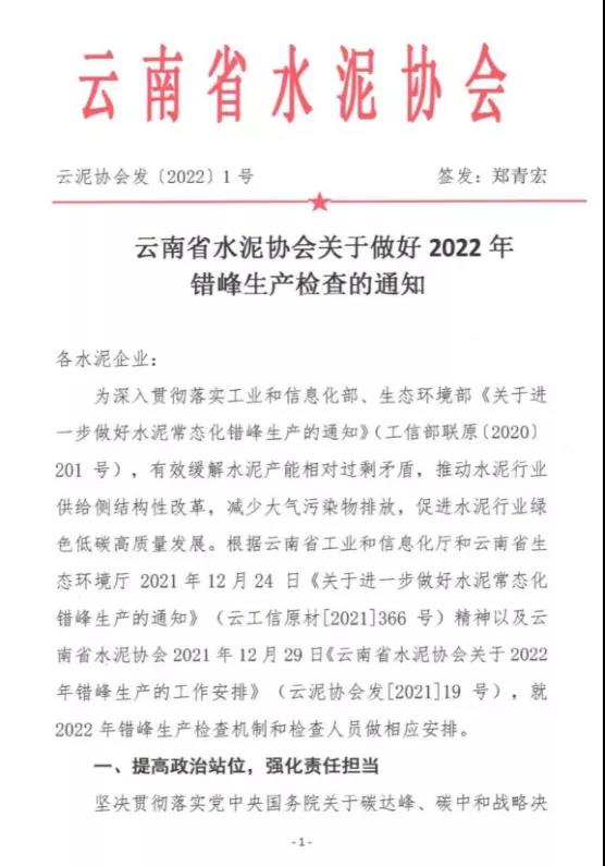日前,云南省水泥協(xié)會發(fā)布《關于做好2022年錯峰生產(chǎn)檢查的通知》稱,為深入貫徹做好水泥常態(tài)化錯峰生產(chǎn),要求完善錯峰檢查機制,加大了檢查力度,落實責任,各片區(qū)分會建立錯峰生產(chǎn)聯(lián)絡機制。